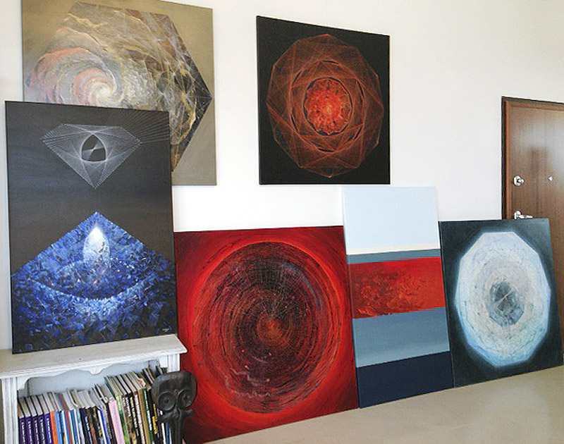 Poszukując malarskich tematów wyruszam w „plener” – w nieograniczone niczym podróże wyobraźni. Odwiedzam światy, w których nie ma nic, co można zobaczyć za oknem. Zmierzam w kierunku minus nieskończoności, w przestrzeń, której wymiary są zwinięte do niewidocznego dla nas punktu. Wymiary te dowolnie rozwijam tak, aby ujrzeć to co kryją…